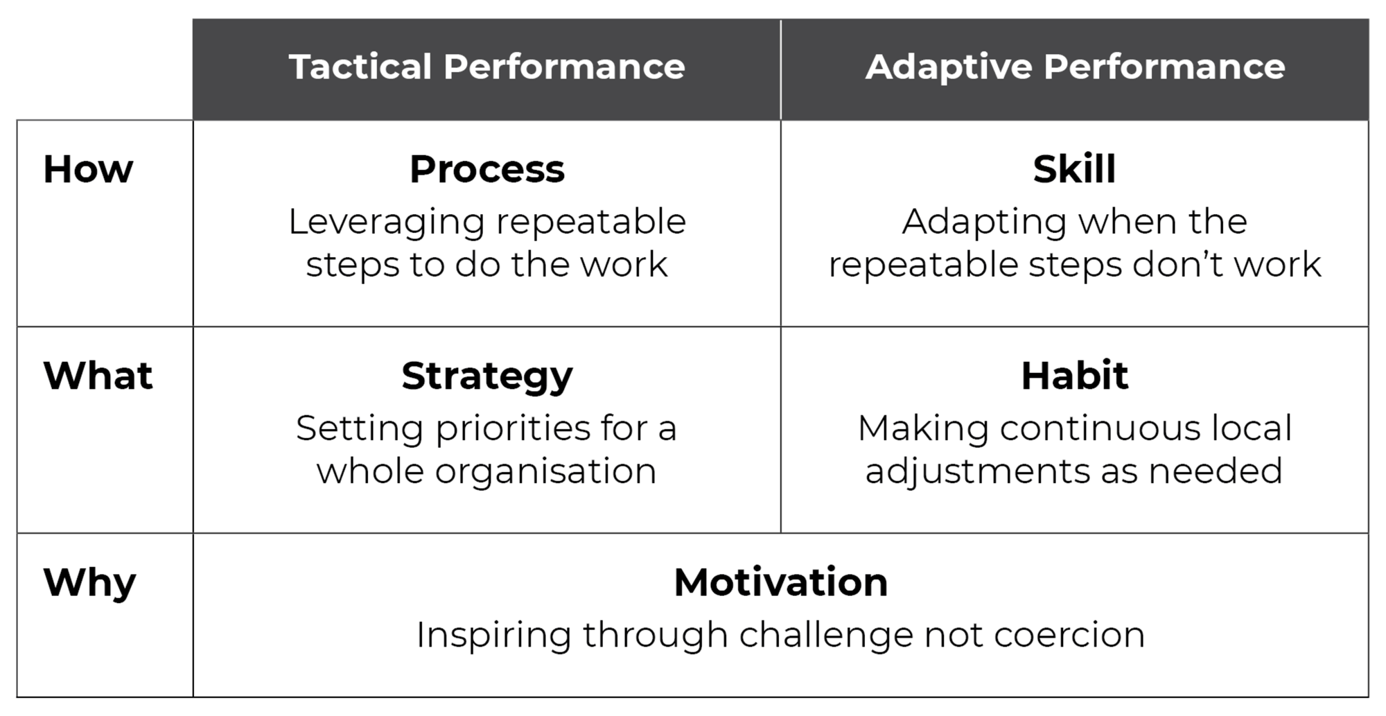 Think about it this way. When driving performance, leaders have to drive tactical and adaptive performance and for each, the why, what, and how.
